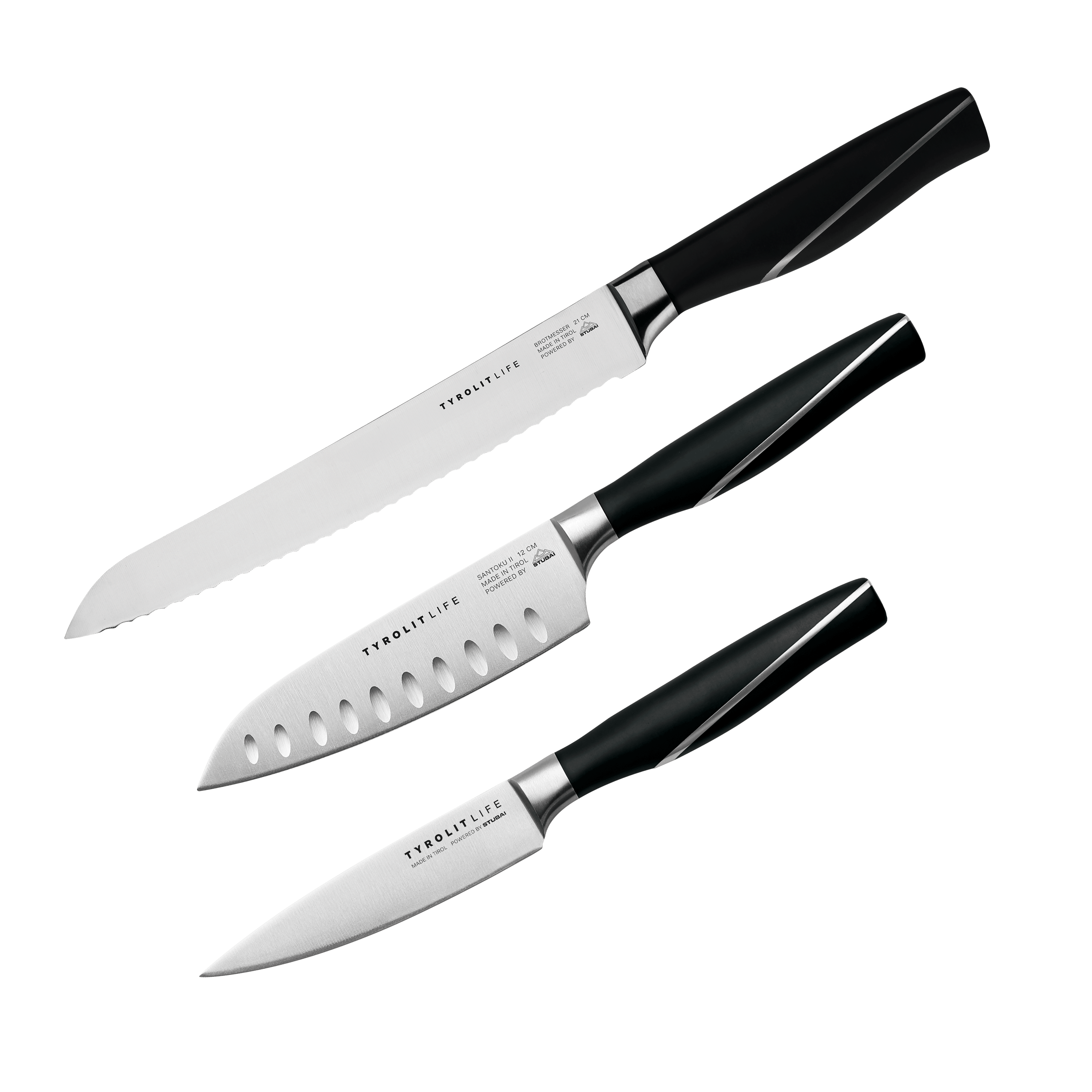 Mit dem Spickmesser schneiden Sie Speck, Salami und Hirschwurst, das Santoku II gleitet butterweich durch alle Arten von Köstlichkeiten, auch Hartkäse, und das Brotmesser schneidet durch die krustige Rinde des Schwarzbrots.